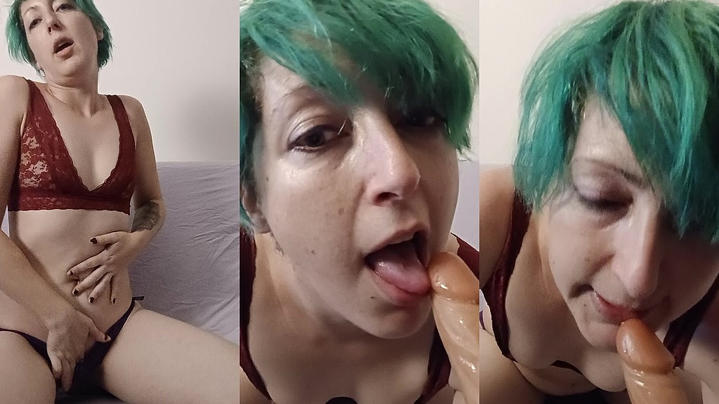 Having some fun dildo sucking til I gag and get messy. Starting in a cute black dress then stripping with some lingerie & tits hanging out fun. A face close up for some dildo play. Lets have some fun together 5m11 high quality video