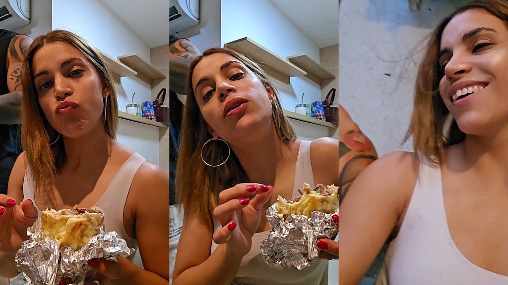 Petite Argentinian eats a meat burrito and drinks coffee while live-streaming with her partner. Open and sexual conversation.