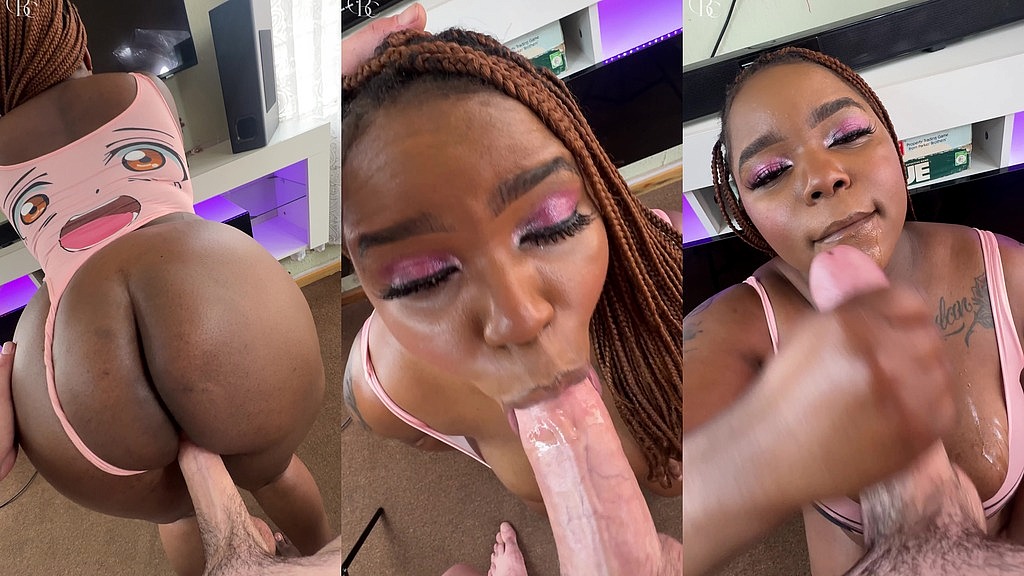 Thick black girl gave a white guy Backshots then she deepthroated his juicy white cock sucking all her pussy juice off until he busted a thick load on her pretty black face