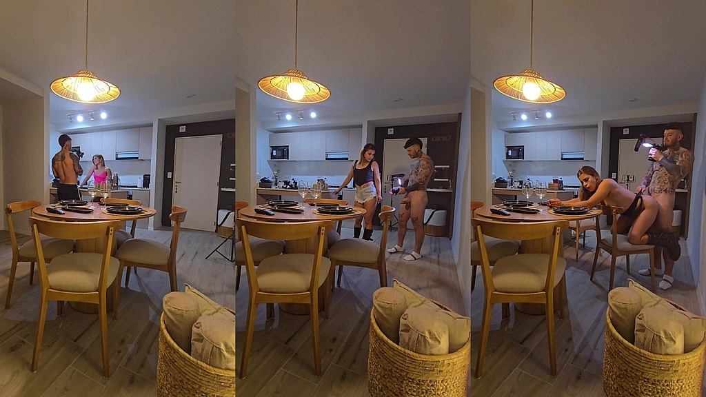 My husband and I staged a scene about stepbrothers! I provoked him by taking off my clothes, so he decided to spy on me while I changed in the bathroom. I caught him and took off his pants to suck his cock and fuck him on the dining room chair like a real slut. He ended up fucking me on all fours and filling my pussy with cum!