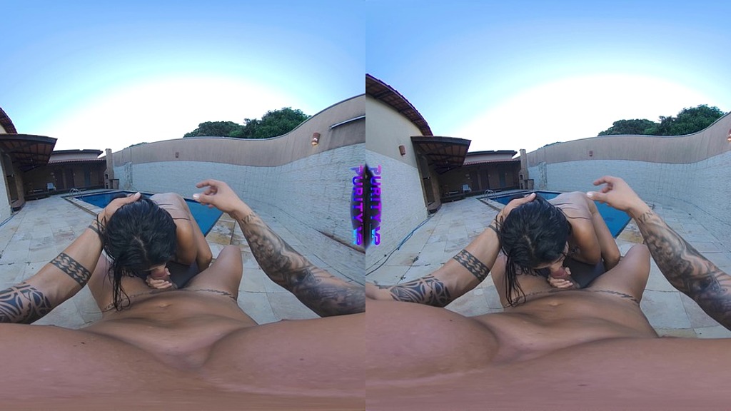 Watching hottie Kayla swim around in the pool is such a turn on, her nimble Latina body with her dark nipples showing through her wet swim top are enough to get you hard. But when she gets out of the pool and stands in front of you with one leg on the bench, her bottoms pulled to one side and fingering her twat, you have to reach into your shorts and pull on your penis. Luckily you don’t have to do that for very long, because she takes over and sucks on your cock, rides you like a girl who hasn’t had dick in a long time and makes you cum.