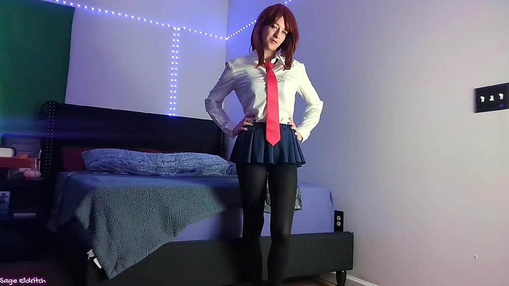 Sage Eldritch has all of her cosplay costumes, wigs, and accessories to show off in a try-on haul. Wearing matching pantyhose and/or thigh high stockings, she shows off each cosplay look [front and back] before moving onto modeling the next. She models each outfit while talking to you about what she likes about each one until she magically appears wearing the next cosplay.