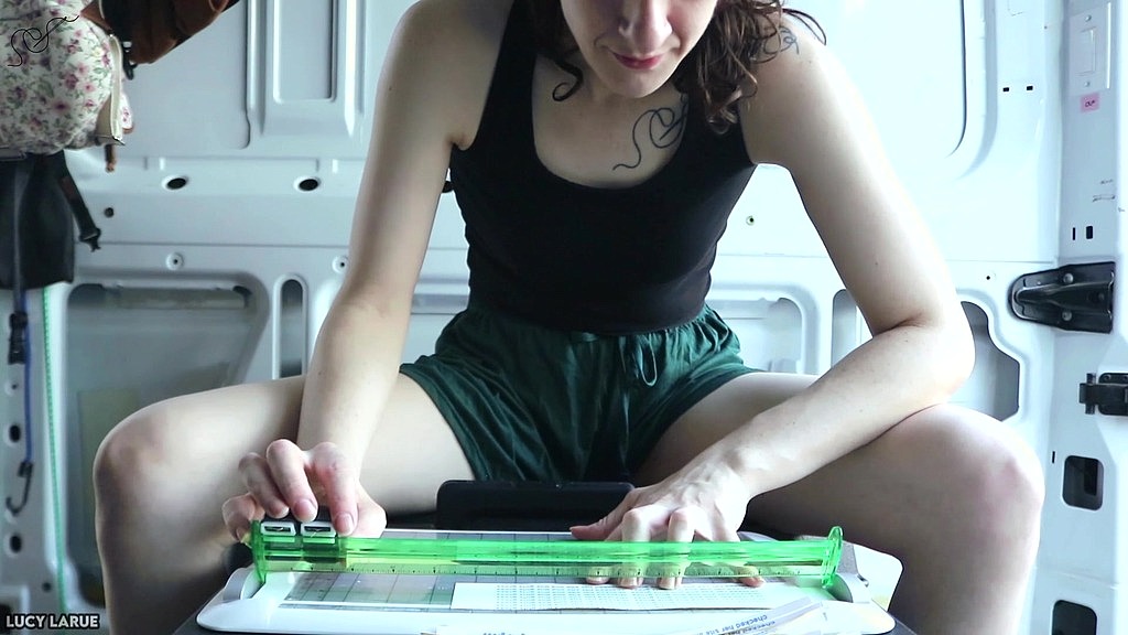 Roaming fetish model Lucy LaRue sits in the back of her porn van, taking a break from travel to use a paper trimmer to slice and separate homemade stickers for her merch! <br>This video is for you if you enjoy: non-nude solo female amateur clips, hand fetish, veiny hands, finger fetish, fingers, fingernails, van, vanlifer, traveler, travel, sun, nature sounds, city sounds, knuckles, significant forehead veins, all natural, ASMR, focus, concentration, collating, crafts, creative, crafting, paper cutting, candid, free spirit, all natural, sfw, pornstar, brunette, girl nextdoor, girlfriend, gfe, girlfriend experience, hanging out, tank top, shorts, merch prep, and real behind the scenes videos!<br>Trailer is 720p, 12fps without sound, full vid is 1080p 60fps with sound. <br>~ Lucy LaRue