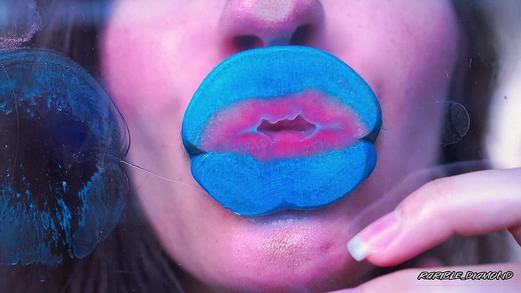 Brace yourself as I sensually glide on a sultry layer of vivid blue lip tint with glossy clear shine, my plump, juicy lips dripping with irresistible allure. I lean in close, pouting seductively, and press a wet, passionate kiss on you, stealing your with its bold, electric heat. Oh, but I’m not done—I slick on another layer of dazzling blue and glossy shine, my lips shimmering like forbidden candy, tempting you to taste their sweet glow