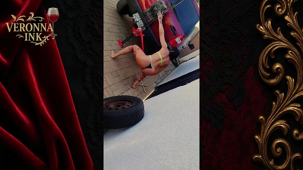 O pneu fura, mas quem assume o comando é Veronna. De biquíni, ela mostra passo a passo como trocar o pneu, enquanto seu marido apenas auxilia a levantar o carro com o macaco. Toda a força e destreza ficam por conta dela, que realiza a troca completa sozinha. O contraste entre a sensualidade do biquíni e a intensidade da tarefa mecânica torna a cena única, revelando poder, autonomia e charme irresistível.