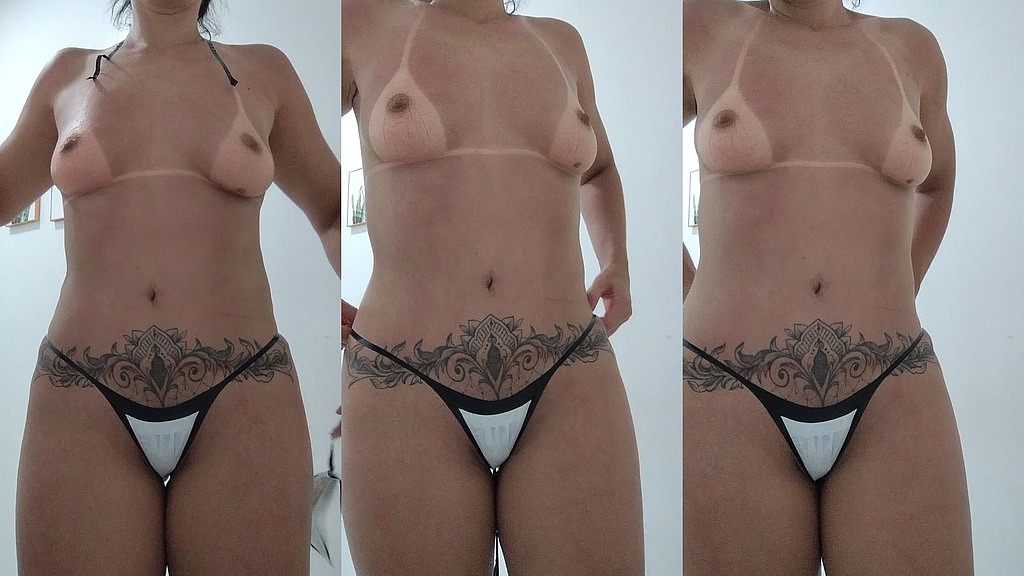 Gatinha gostosa fazendo bronzeamento de fita e mostrando as marquinhas,essa puta é mesmo uma safada muito gostosa e adora levar rola dos machos com aprovaçõa do marido corno