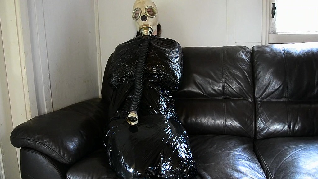 In this video you can see how the hot submissive milf with gas mask wrapped in plastic first lies and is then placed on the sofa...