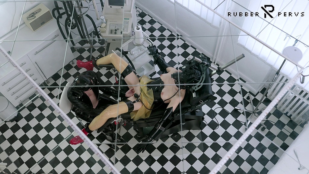 The rubber Patient had a Treatment at the Rubber clinic. Being inspected from inside and outside and wearing a gasmask with a hose, she got an anal examination and a blow-up-plug into her ass and fingering the pussy.