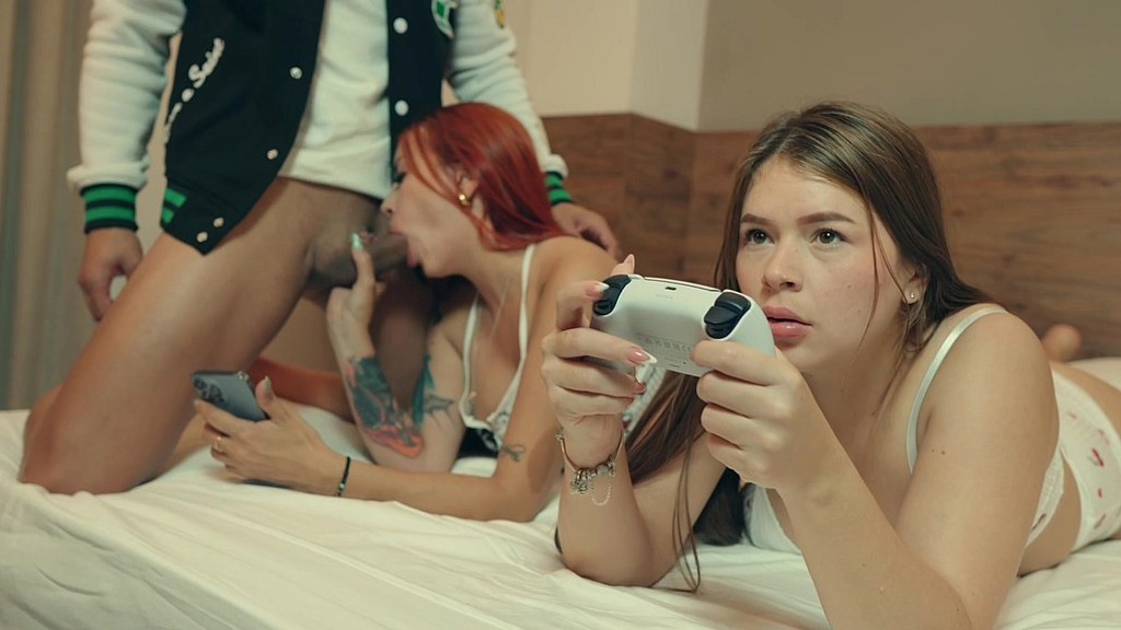 Ema Ribeiro and Andrea Castro are playing on their PlayStation when Milan arrives to play with their feet. He sees their beautiful asses and decides to massage them. He takes out his cock and inserts it into their tight pussies until he cums inside them.
