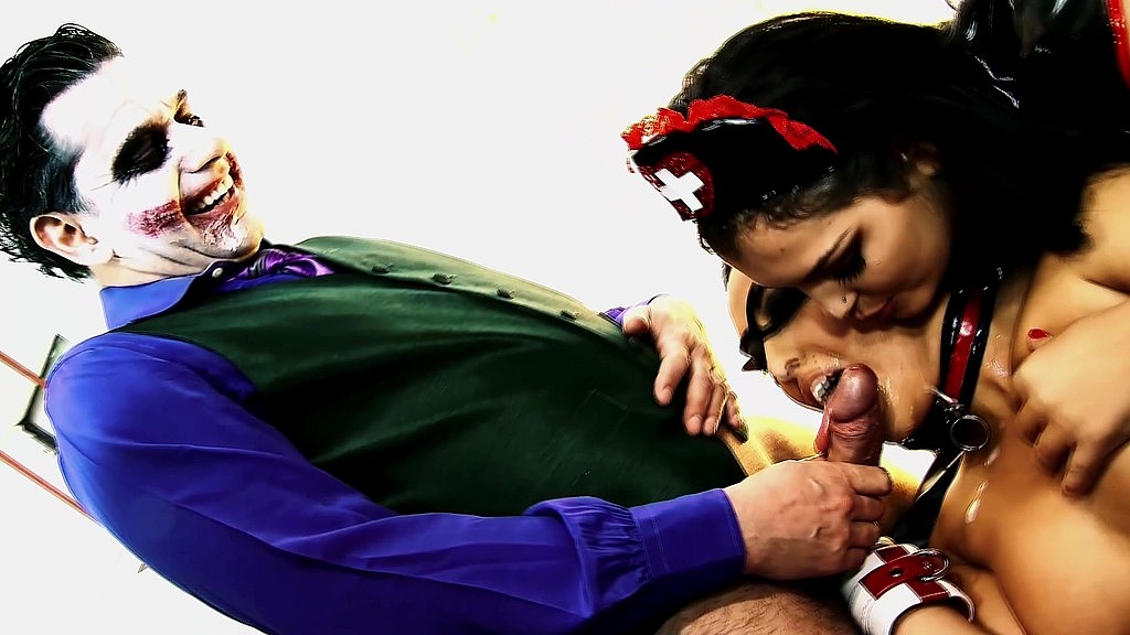 Infamous Jokester throws a raunchy sex party in Gothard City, and sluts Kaia Kane, Anna Lovato, Cindy Behr, and Jasmine Black eagerly join the orgy. Wearing revealing costumes, these lustful babes suck multiple cocks, engage in hardcore fucking, and get their tight pussies pounded relentlessly all night long. They finish dripping with cum, exhausted and satisfied from the gang bang.