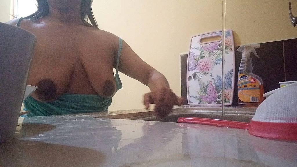 Video actuado, la puta ama de casa se encuentra lavando platos hasta que siente que su vecino la espía por la ventana ella empieza hablar cosas sexys para calentarse y le enseña las tetas al perverso vecino espía, real casero amateur.