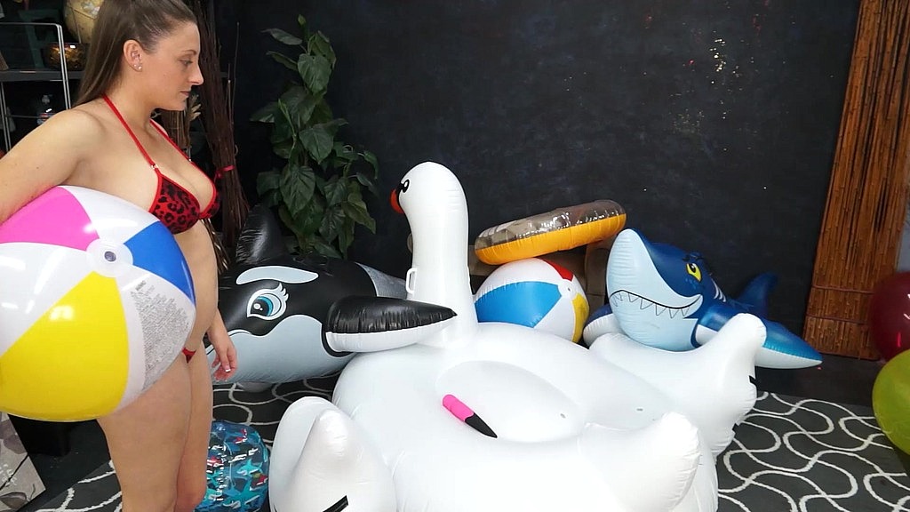 Melanie was supposed to meet a friend and go to the beach, but she arrived and discovered her friend was not around, but left her vibrator out, so Melanie pleasured herself with the vibrator. Post orgasm, she takes her frustration with her friend out on 2 of the inflatables on hand.