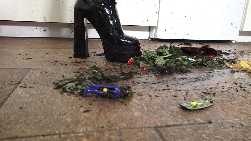 Nothing is sacred to the sexy boot bride Asmodia! She loves to crush everything with her heavy boots. Today the time has come again to take the life of some things with her platform boots. The totally hardened fur-boot brat first crushes a grapefruit and a melon until only a sauce is left on the floor. Then she crushes a plant with her kicking boots. This degenerate crush princess simply has a lot of fun destroying things with her boots. Whether kicking, trampling, ballbusting or crushing - she just wants to see everything suffer under her feet.<br>After the plant has been flattened, she chops up the two action figures into dozens of small pieces. And finally she the life out of some balloons.