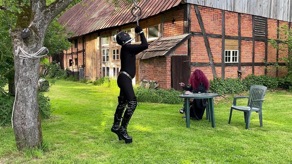 Watch as I, the dominatrix, restrain my slave in a metal bondage device, forcing him to stand on tiptoes with a rope tied to a tree. He s wearing high-heeled boots, or rather heel-less boots, leaving him no choice but to balance on his toes. This all takes place outdoors, in a meadow, beneath a tree. Once secured, I take a seat at the table, leaving him restrained while I smoke and enjoy my own company. Experience the thrill of domination and submission in this captivating scene.<br><br>Feat. GrayNoice<br>Tags. restraints