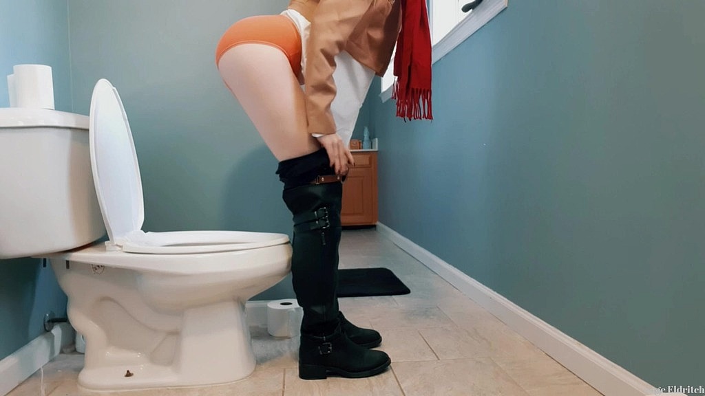 From a voyeur perspective, watch Sage Eldritch, cosplaying as Mikasa Ackerman [Atttack on Titan], enter the bathroom and walk over to the toilet. She is wearing her uniform with tall leather boots, and her signature red scarf. She pulls down her pants, revealing the cotton panties underneath. Pulling the panties down to her knees, Mikasa sits upon the toilet and then relieves herself. After she s done peeing, she wipes and pulls her panties and then pants back up. She then tucks her shirt in and adjusts the straps around her thighs. She then flushes the toilet and leaves the room.