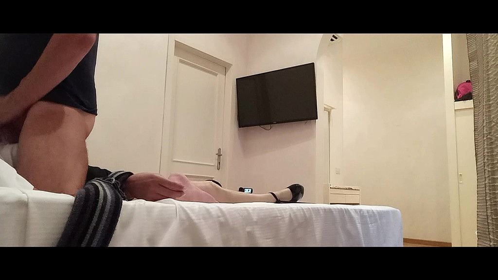 I m tied up in a hotel bed, wearing sexy clothes, heels, and stockings, hooded, and with a ball gag in my mouth to keep from screaming. He fucks my pussy hard and ends up cumming on my face.