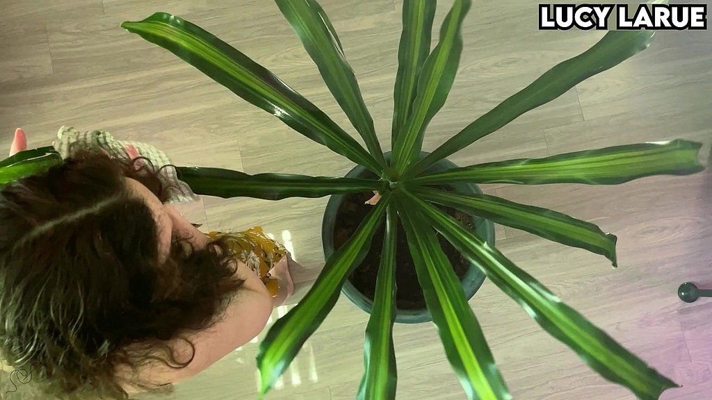 From above watch Lucy LaRue remove a dull layer of dust from one of her large houseplants. She is barefoot, topless, and wearing a burnt-orange floral half apron. <br>Trailer is 720p, 12fps without sound, full vid is 1080p 60fps with sound. <br>~ Lucy LaRue