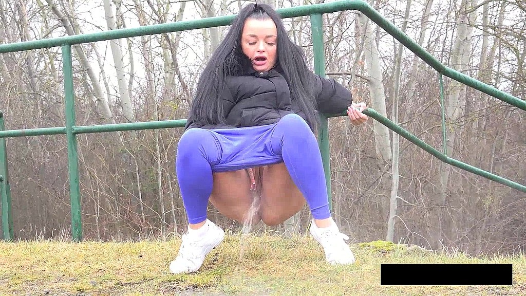 Dark haired Dafne returns to Got2Pee and rushes across a field looking for somewhere to relieve her piss desperation. She stops next to a railing and pulls down her leggings before squatting to pee. She holds onto her pussy while spraying a messy stream of piss down onto the grass beneath her!