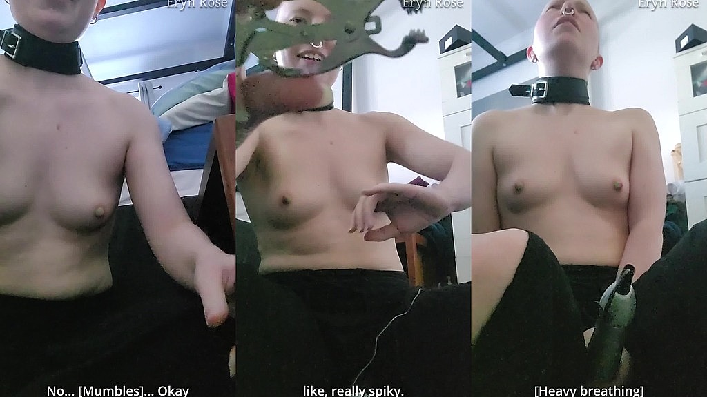 With my chunky collar securely chained to the underbed cage, I start by stretching out some chunky elastrator bands before applying them to my nipples to keep the tips puffy, swollen and exposed. These tiny elastic bands are super strong, so I test them away from my body first just in case they snap! I struggle to reach things and reposition the camera with the restrictive chain pulling on my neck every time I move. I grab my doxy and use it over my trousers as I pull against the chain and massage my sensitive nipples. Wanting to suffer more to get myself off I fish out my meanest pair of clover clamps which have cruel metal spikes on them! It takes me a long time to get brave enough to put them all the way on, then I reward myself by turning the Doxy vibrator wand up and enjoying the delicious blend of pain and pleasure. Post orgasm, the pain is instantly too much so I take the clamps off but continue to enjoy the vibrations coursing through my clit. When done, I pull the elastrator b