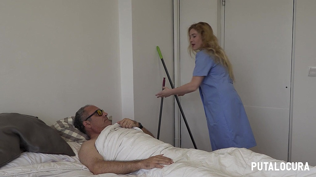 Este enfermito tiene mucho morro y mucha calentura. No hace otra cosa que quejarse, y la limpiadora, muy buena ella, le intenta ayudar de una manera un tanto especial para quitarle los dolores.