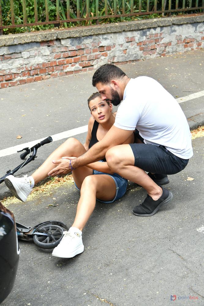 Cute tattooed blonde Ria Sunn is enjoying using her scooter in the city when she is accidentally reversed into by Lorenzo in his van. She hurts her leg and Lorenzo quickly comes to the rescue, helping her into his car. He takes a few details from Ria and gives her a lift. While they are driving, naughty Ria realises how hot Lorenzo is and rubs her pussy through her denim pantyhose. She strips off and starts to masturbate while Lorenzo struggles to concentrate, glancing in the rear view mirror! They pull over and Lorenzo licks Ria s pussy in the back of the van before Lorenzo stops off to give his boss, Darrell all the details. It doesn t take long before Ria gets naked again and this time she gets to play with two rock hard cocks! She sucks them both off and gets all holes stuffed as the guys take turns between her pussy and ass. Together they DP her and Ria waits with her mouth open to take both of their loads!