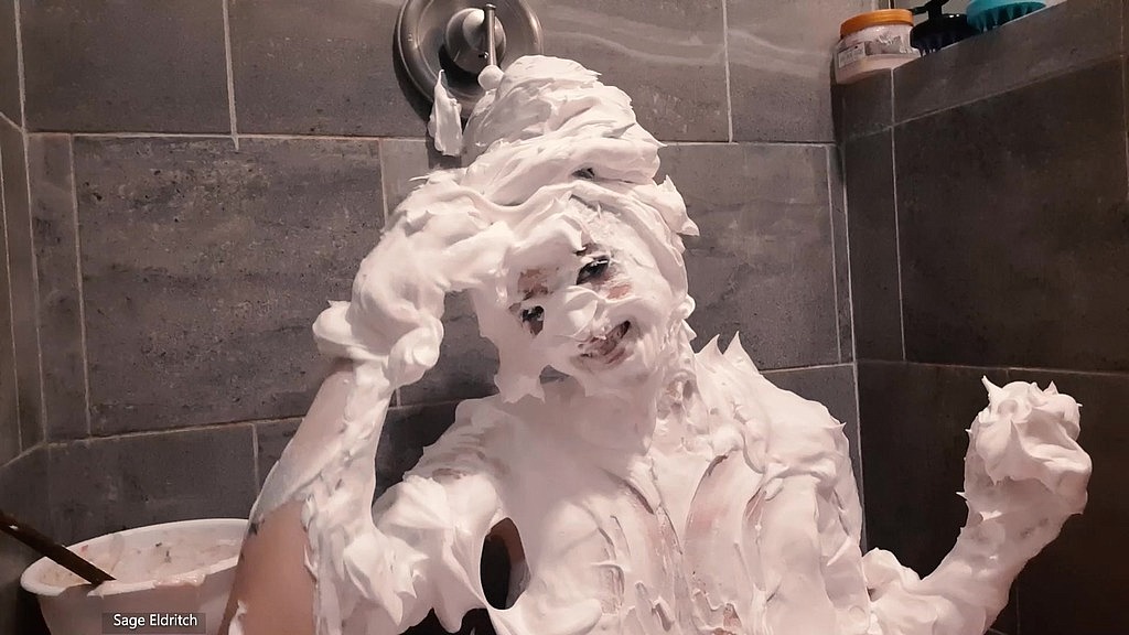 Sage Eldritch is sitting in her shower with the camera focused only from her shoulders and above. She has already prepared 10 entire cans of shaving cream into pies and has three separate bowls of cake batter prepared. She begins by pouring each bowl over her face and head before moving on to pie-ing her face and hair with the many pies around her. She does two-pie sandwiches and single face pies all while smearing the white creaminess all around on her skin and hair. She even styles her hair in ridiculous hairstyles having fun throughout the entire video.