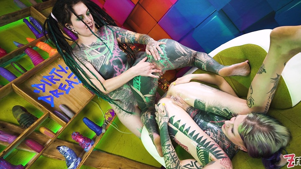 The three tattooed bitches got together so Anuskatzz and Illuz could make Serpienta their cumslut. They lube up her asshole and finger it as Anuskatzz fingers her own shaved and tattooed pussy. The girls have Serpienta with her ass sticking in the air and a dildo penetrating her. The dildo starts to cum all over her holes making the girls push the fake cock in and then pulling it out with cum oozing all over. Anuskatzz wants in on the action, so Illuz gets some of the cum, rubs it on her ass and fingers Anuskatzz’s asshole. The dildo is next and before you know it it has cum dripping all over Serpienta.