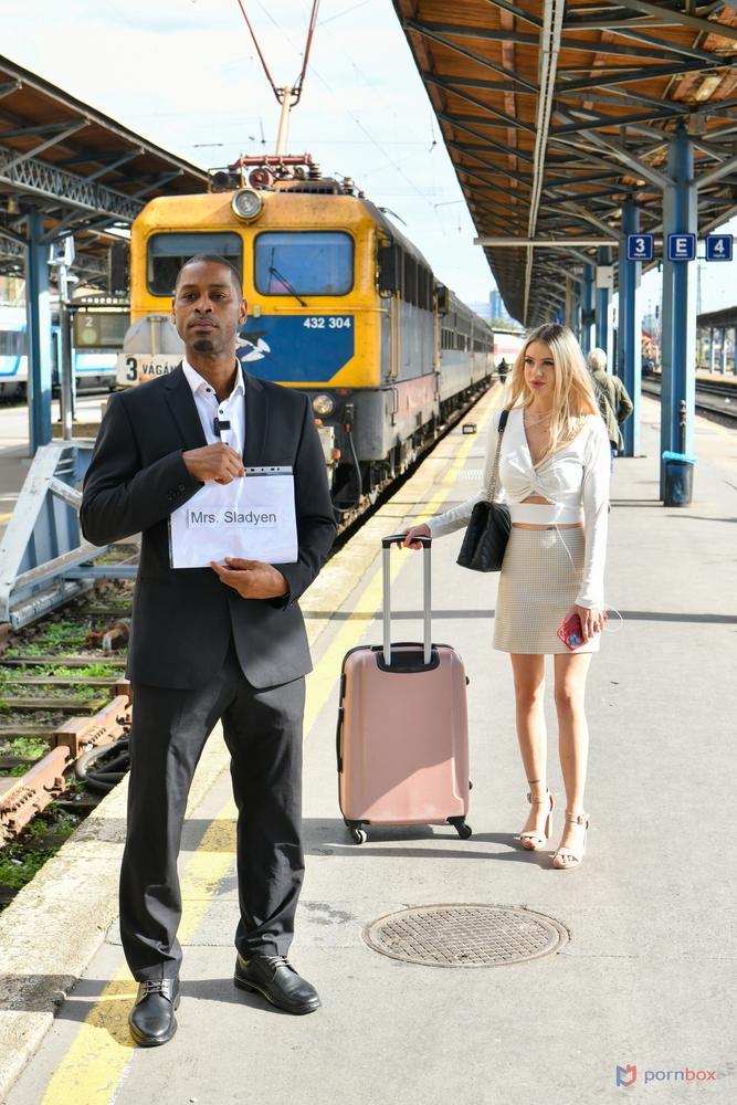 Hot blonde Sladyen Skaya arrives at the train station and meets with her designated driver, Darrell. They set off and Darrell asks Sladyen about her trip. She explains that she has found out that her husband is cheating on her, so she is planning on maxing his credit card. This scorned blonde asks Darrell to pull over and join her on the back seat, then makes her move, rubbing her hand over his crotch. Sladyen takes out his BBC and strokes him off before sucking him off with her pierced tongue! They fuck right there in the car before making their way to Sladyen s apartment for the week where they meet the owner, Lorenzo. While Sladyen looks for her phone, Darrell uses hand gestures to tell Lorenzo what just happened and leaves them alone while he goes to check the car. This absolute nympho makes her move on Lorenzo too and wraps her lips around his cock! She bends over for a doggystyle pounding when Darrell returns and starts filming their escapades! Sladyen sucks on Darrell s shaft wh