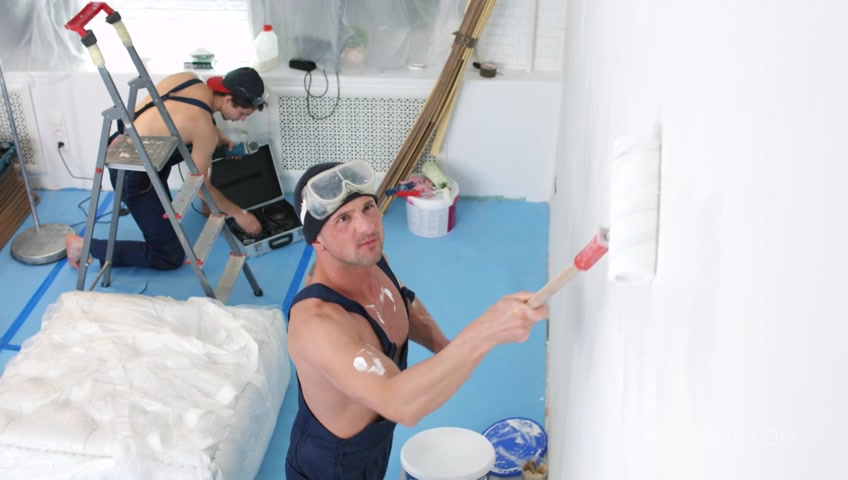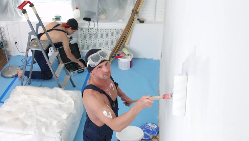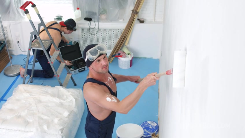 Skinny blonde double penetrated with workers