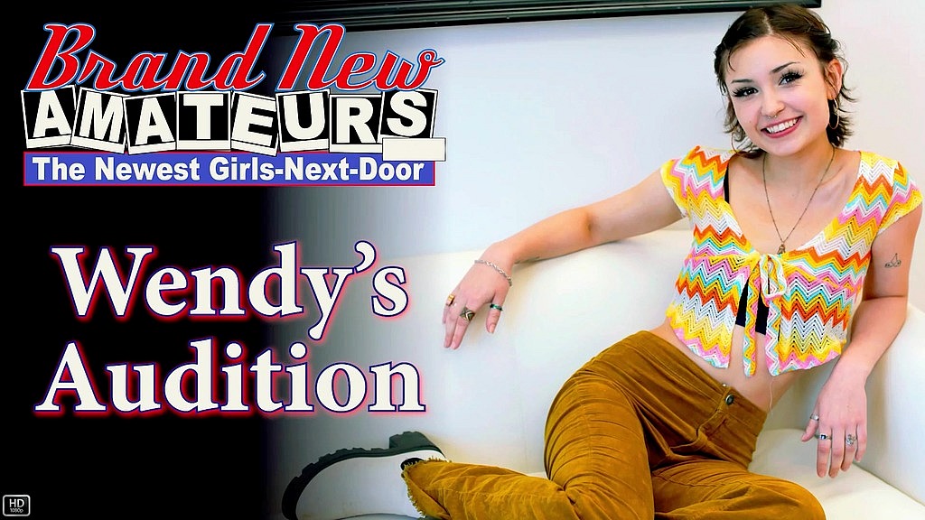 Petite horny brunette cutie Wendy takes off her clothes showing off her skinny body and juicy small titties as she rubs her pussy comfy on the couch before sucking a hard cock and getting banged!