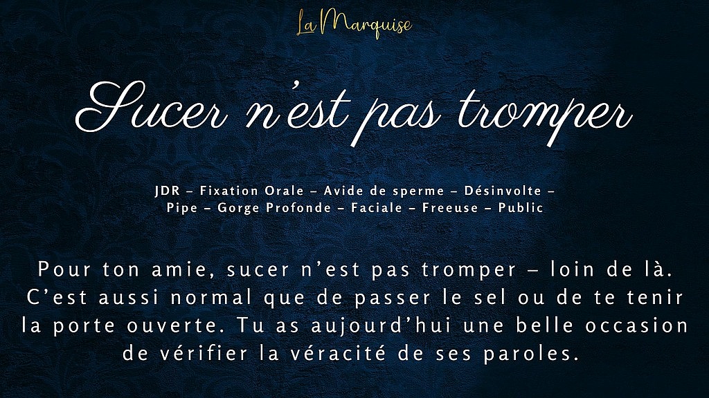 Pour ton amie, sucer n’est pas tromper – loin de là. C’est aussi normal que de passer le sel ou de te tenir la porte ouverte. Une belle occasion de vérifier la véracité de ses paroles.