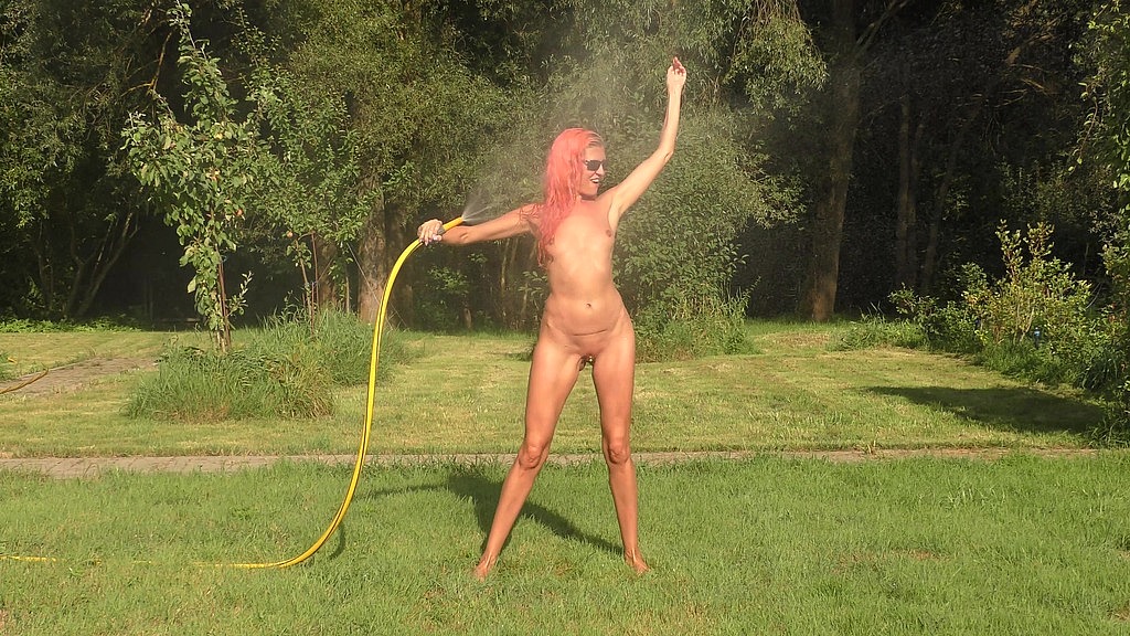 Look how a completely naked girl cheerfully plays with a hose with water)<br>Cold water hits her tanned body and flows down it...<br>It s exciting!<br>And then, the hose moves to the clitoris... a stream of water hits the clitoris... Orgasm!<br>Sorry that I got carried away playing with a stream of water and started masturbating with a stream!