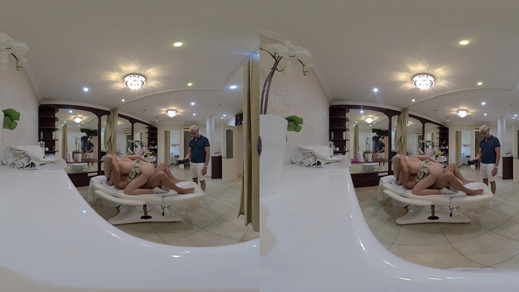 Watch this virtual reality (VR) version of a sexy newcomer with a perfect tight teen body, Una Fairy. Filmed from a behind-the-scenes, aka voyeur angle, at a 180-degree angle, you will experience what it would be like to be there with this naughty newbie. Matt Bird takes a break from work at his hair salon when his girlfriend, Una Fairy, comes over to visit. The pretty teenager tells her boyfriend that she is super horny and that she wants him to bang her at once. Matt does his best to resist her, but when Una Fairy bends over and shows him that she is not wearing any panties, he cannot control himself. Matt throws his petite girlfriend on the chair and fucks her while she still has her skirt on with this huge cock. Little Una Fairy loves taking his monster cock in her tight teen pussy, but Matt knows what she truly craves. The muscle-bound man fucks the skinny 19-year-old in the tight ass. Matt takes Una Fairy to the back of the beauty salon and puts her salon bed on so he can give he