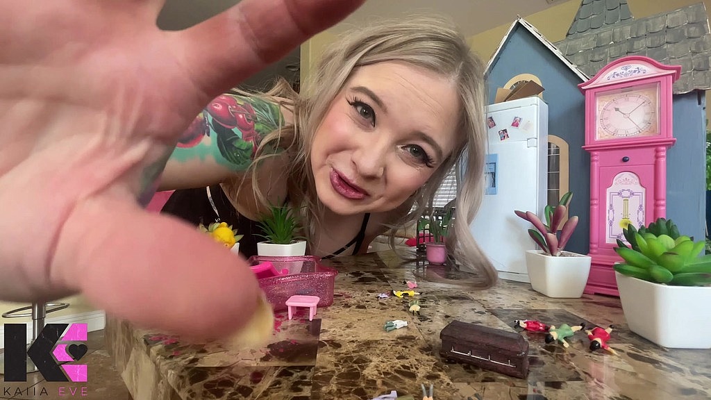 My friend is out of town and I am housesitting. I stop by to water her plants and feed her cat. When I get there, I can hear something, I can hear these tiny little screams coming from somewhere. As i get close to what i thought was her dollhouse, I saw this tiny little people, and they were the ones screaming! I get down to eye level with these tiny little creatures, and I can see that they are actually tiny people and they are in the middle of a funeral! I ask one of them why they are screaming and fighting, but to my dismay, I can t understand their tiny language. As I inch him closer to try to listen, I get a big wiff. Why does he smell so good? He smells so good that my mouth starts to water. I am surprised with myself, this has never happened, but I can t help it, and I pop him into my mouth just one to taste. I am so surprised - the way he tastes, crunches, and slides down my throat into my belly, Ive never had anything better. This is a delicacy ive stumbled on at my friends ho